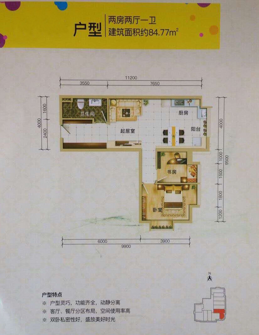 84.77户型 户型灵敏,功能齐全,动静分离 客厅,餐厅分区布局,空间使用率高 双卧私密性好